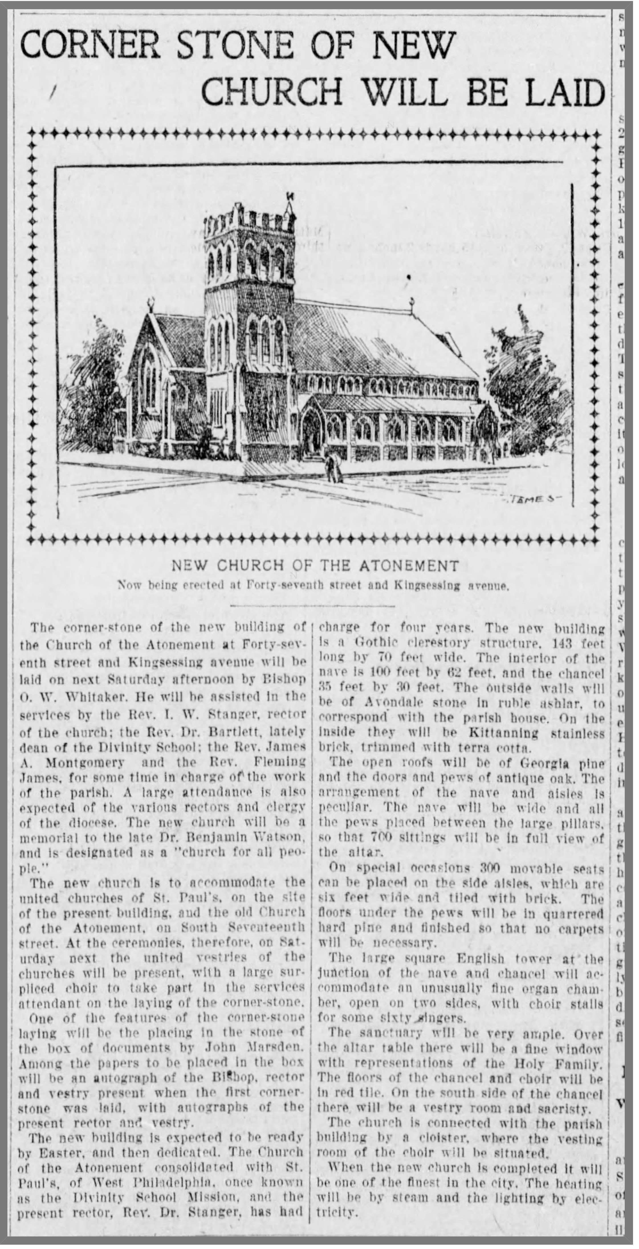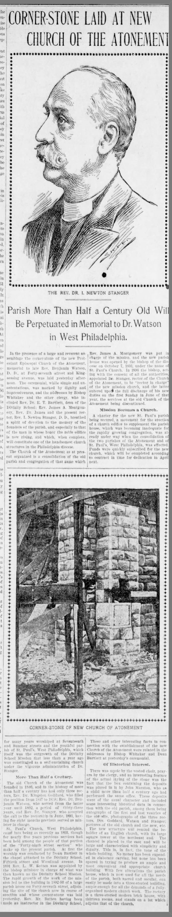 This entry was posted in Church of the Atonement and tagged Benjamin Watson, Fleming James, James A. Montgomery, Philadelphia Times, University City, West Philadelphia on May 8, 2016 by mjk38.