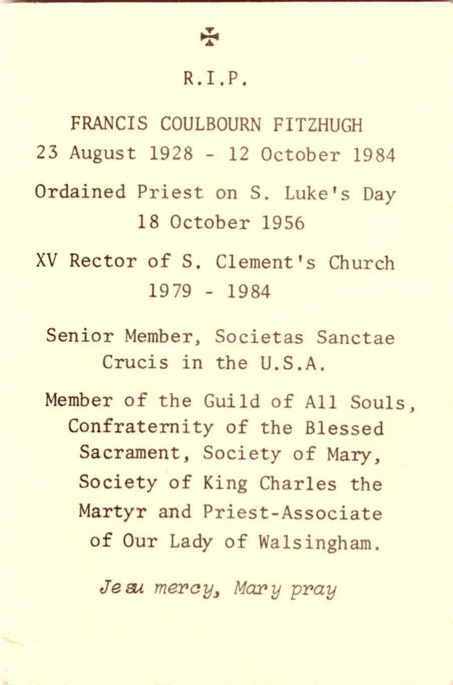 Service Leaflet for the Requiem High Mass and Absolution of the Dead for the Repose of the Soul of Rev. Francis Coulbourn FitzHugh at St. Clement’s Church (1984)