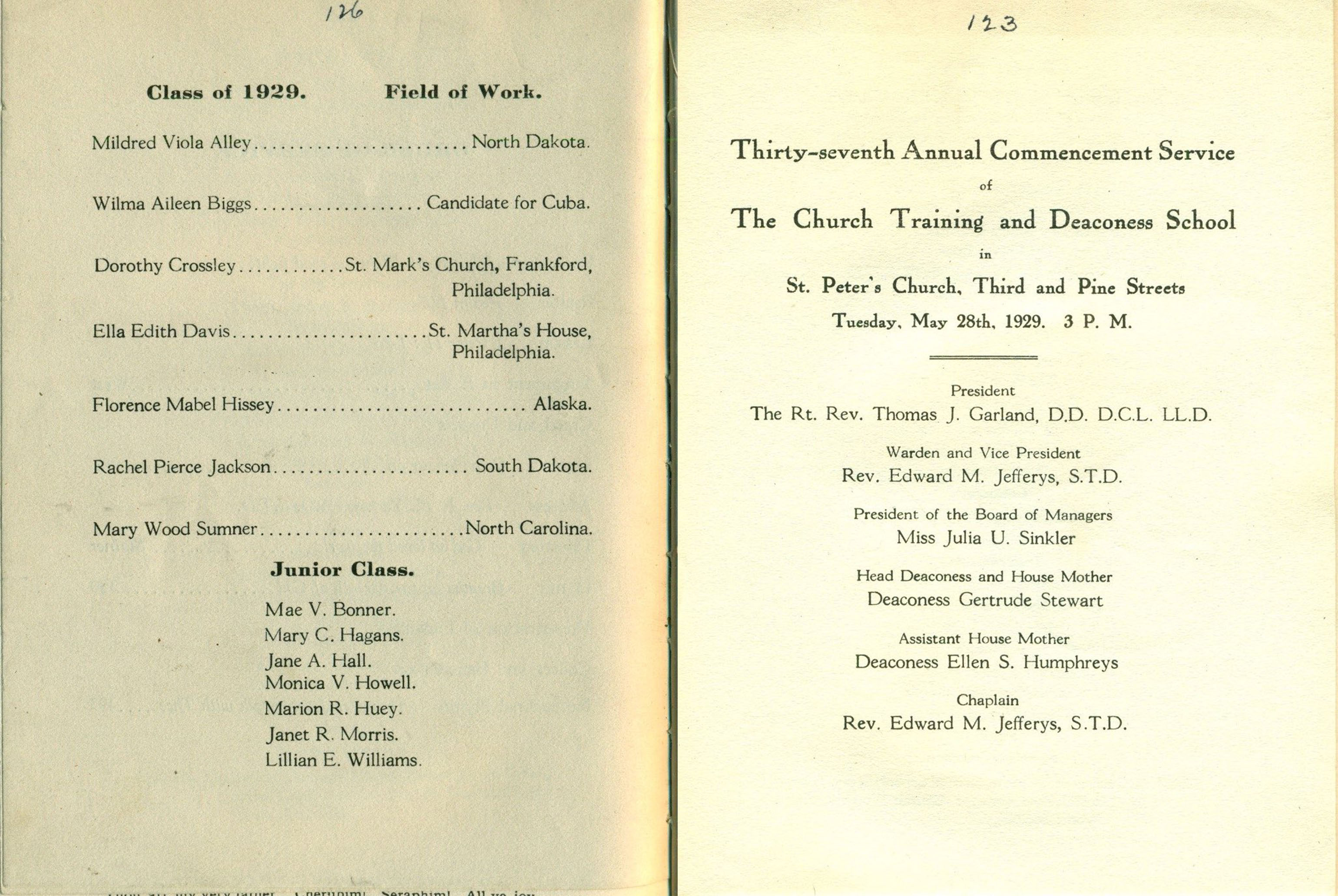 Leaflet for Annual Commencement Service of the Church Training and Deaconess School at St. Peter’s Church, Philadelphia, 1929, 1933, 1936, and 1938