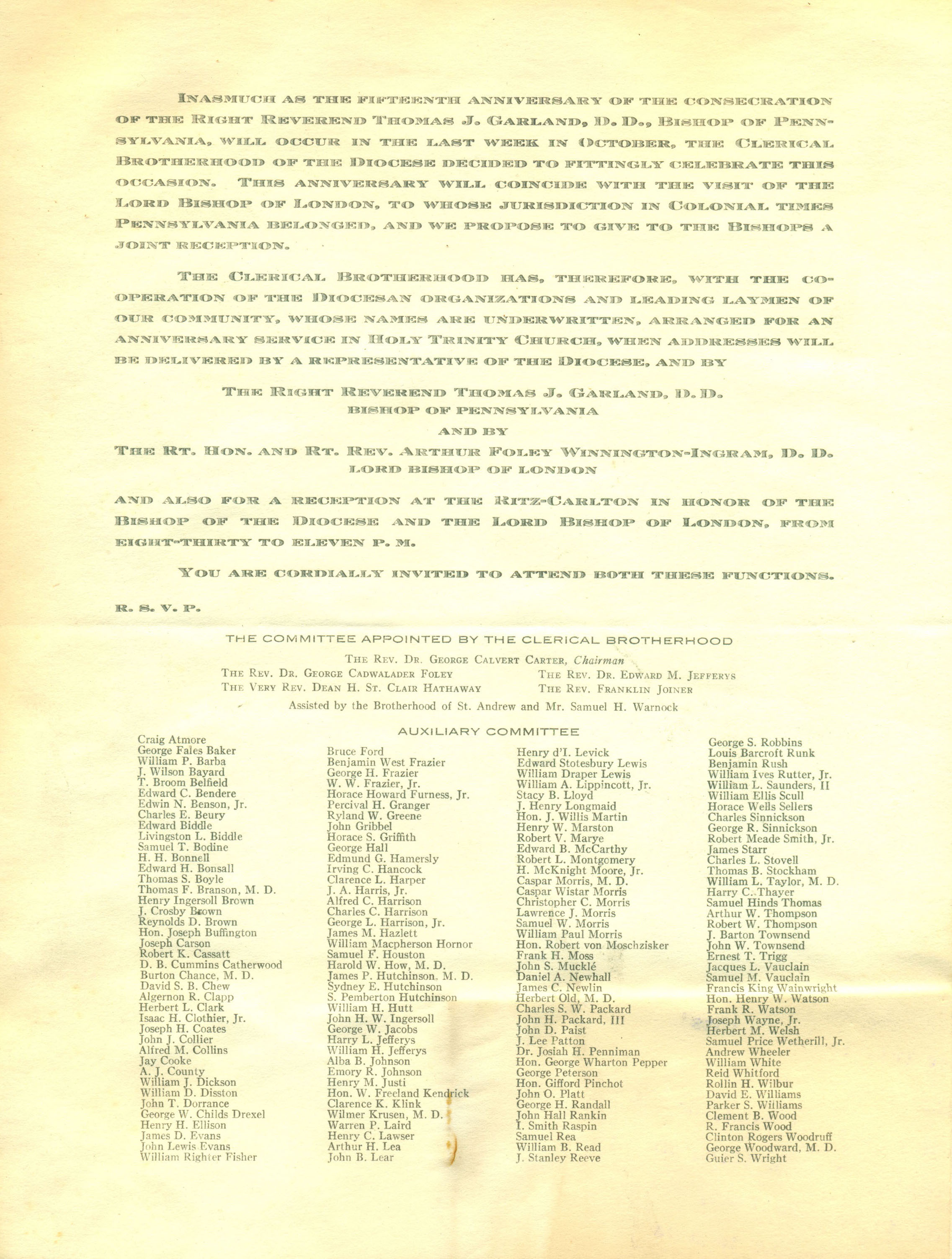 Notice of the 15th Anniversary Service of the Consecration of the Rt. Rev. Thomas J. Garland at Church of the Holy Trinity, Rittenhouse Square (1925)