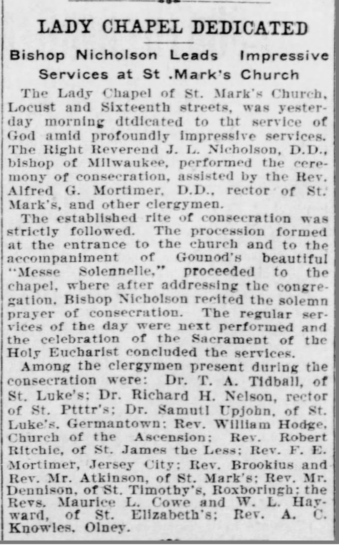 Lady Chapel Dedicated at St. Mark’s Church, Philadelphia (1902)