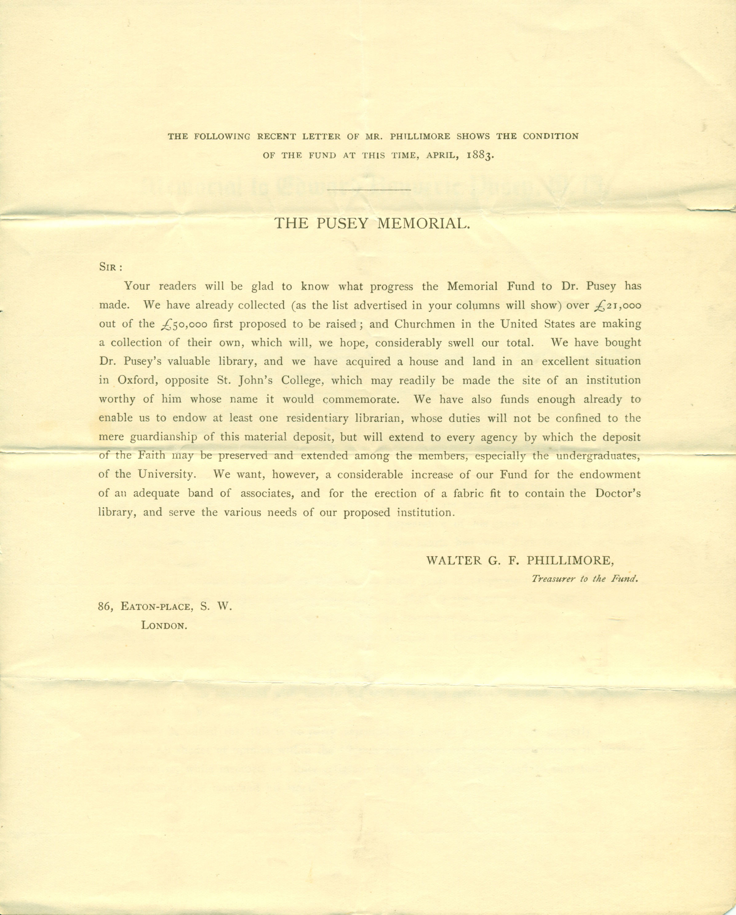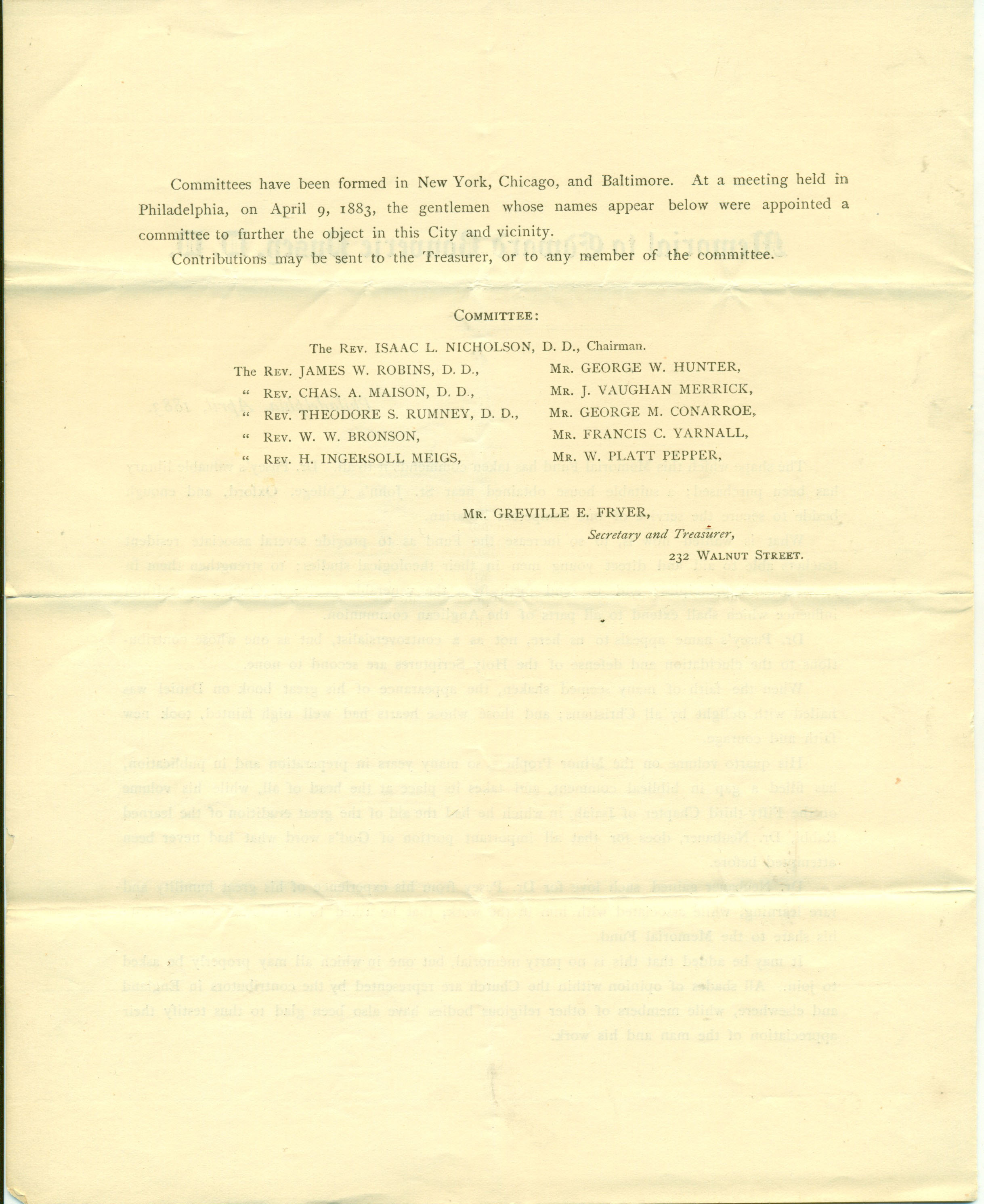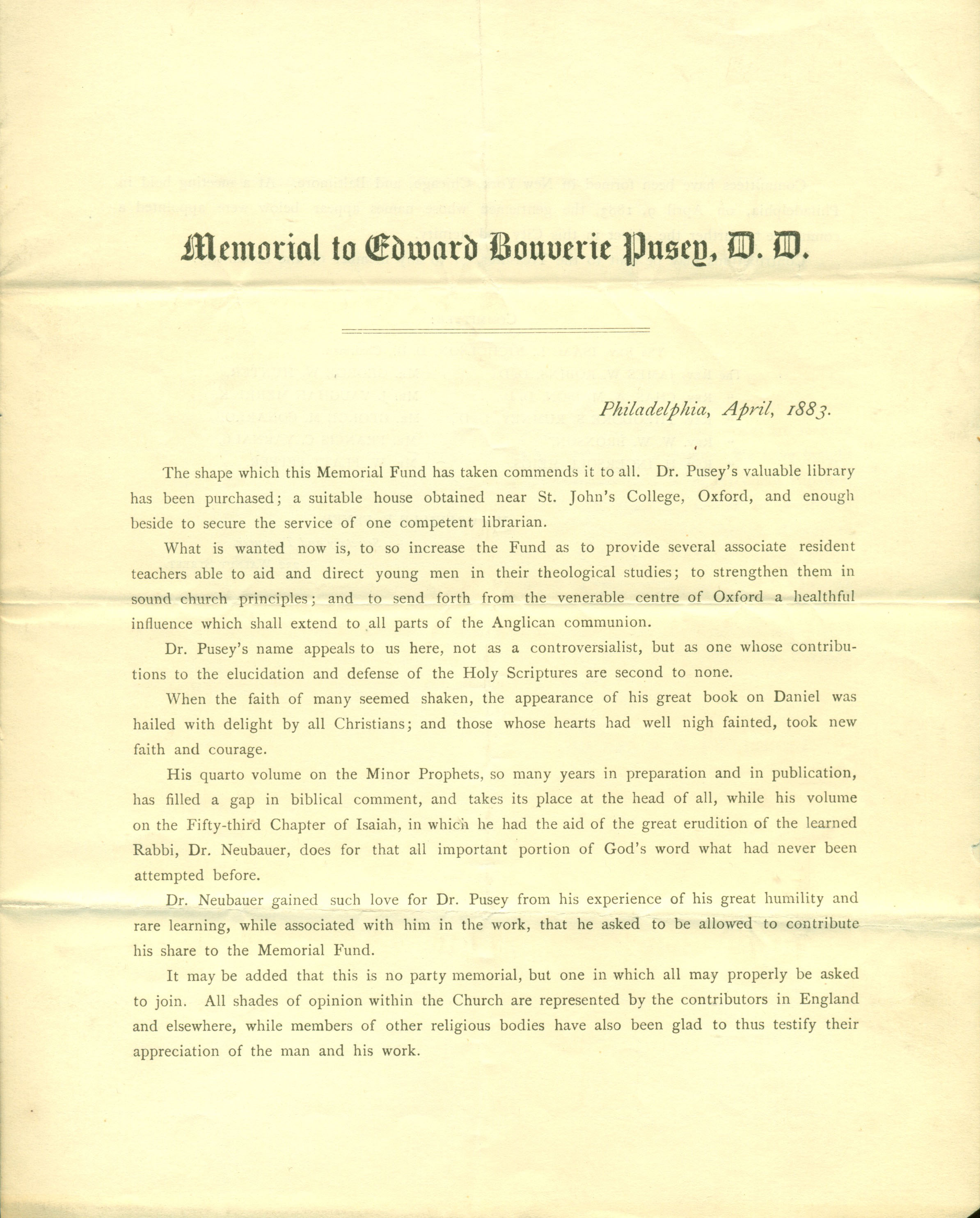 Philadelphia Committee Seeks Funds for the Memorial to Dr. Edward B. Pusey (1883)