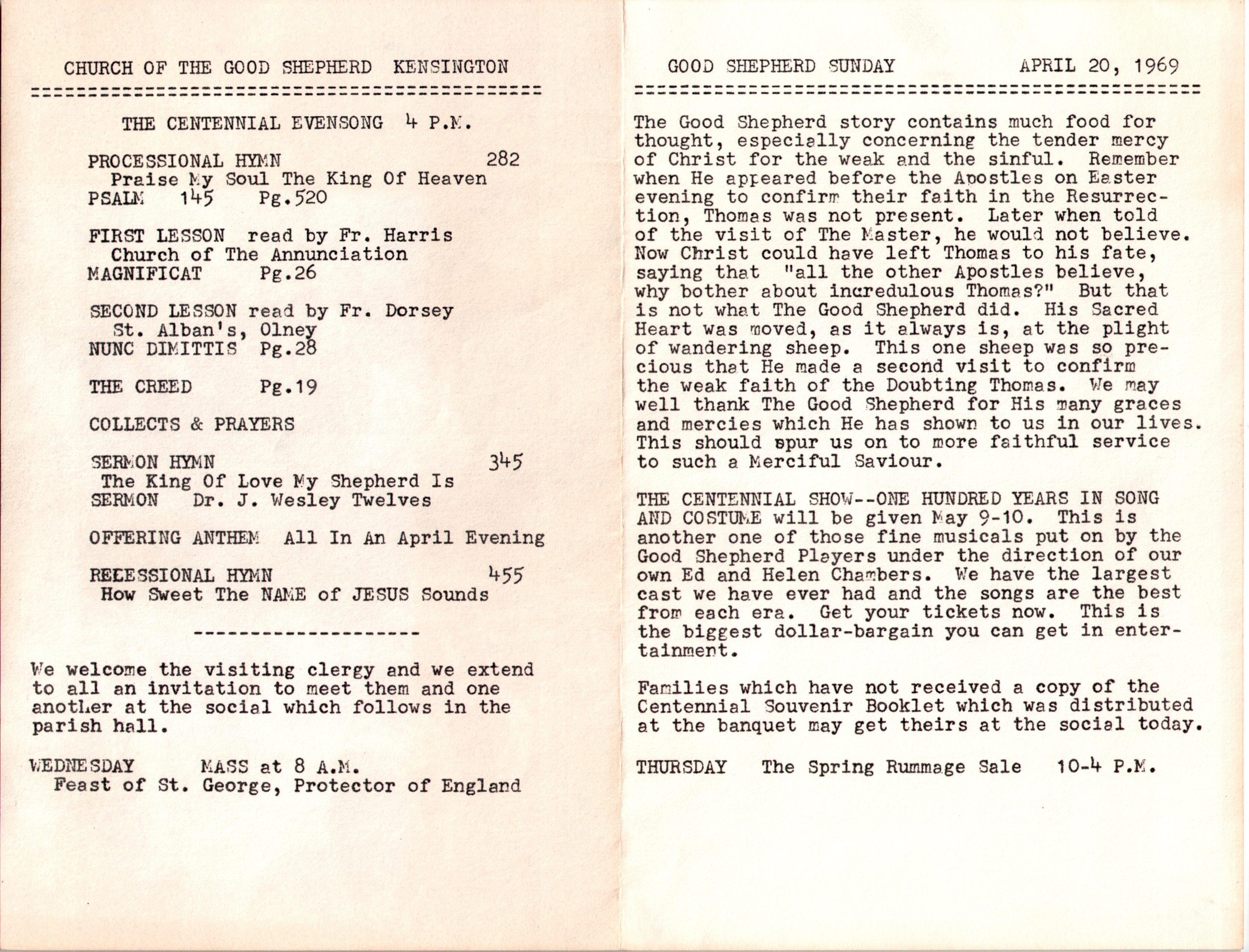 Leaflet for the Centennial Evensong at Church of the Good Shepherd, Kensington (1969)