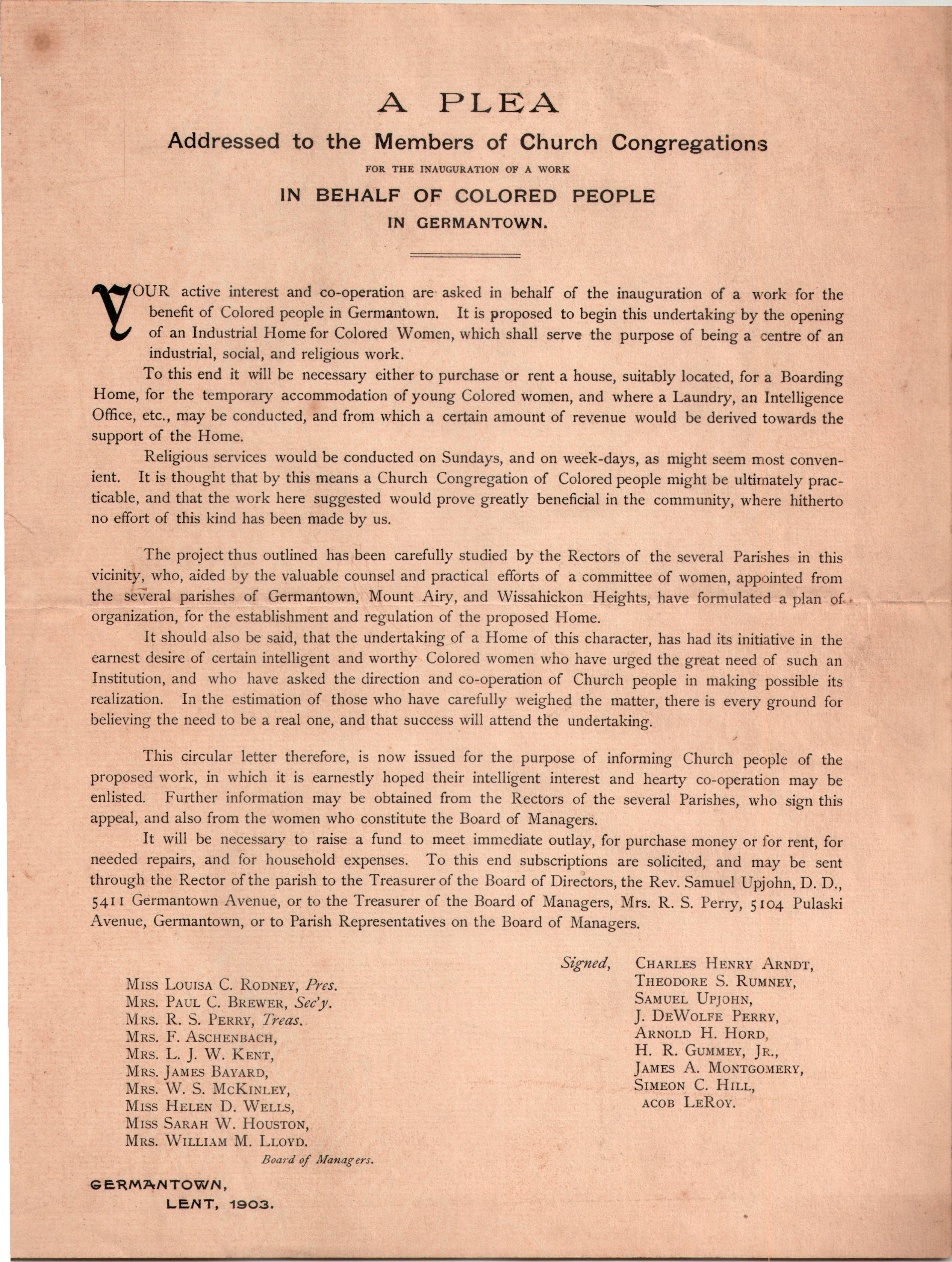 A Plea Addressed to the Members of Church Congregations for the Inauguration of a Work in Behalf of [African-Americans] in Germantown (1903)