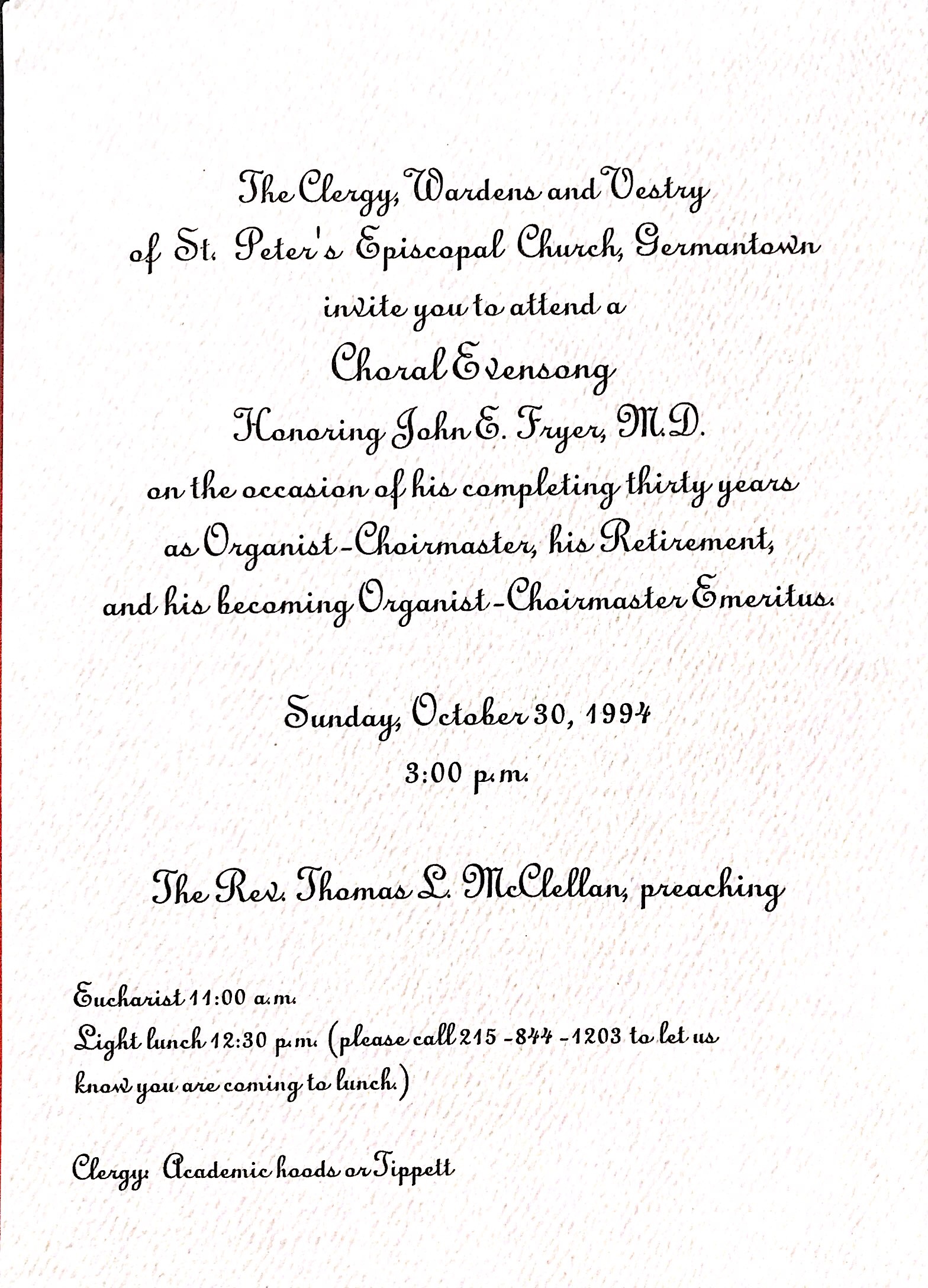 Invitation to a Choral Evensong Honoring John E. Fryer, MD, on His Retirement as Organist-Choirmaster at St. Peter’s Church, Germantown (1994)