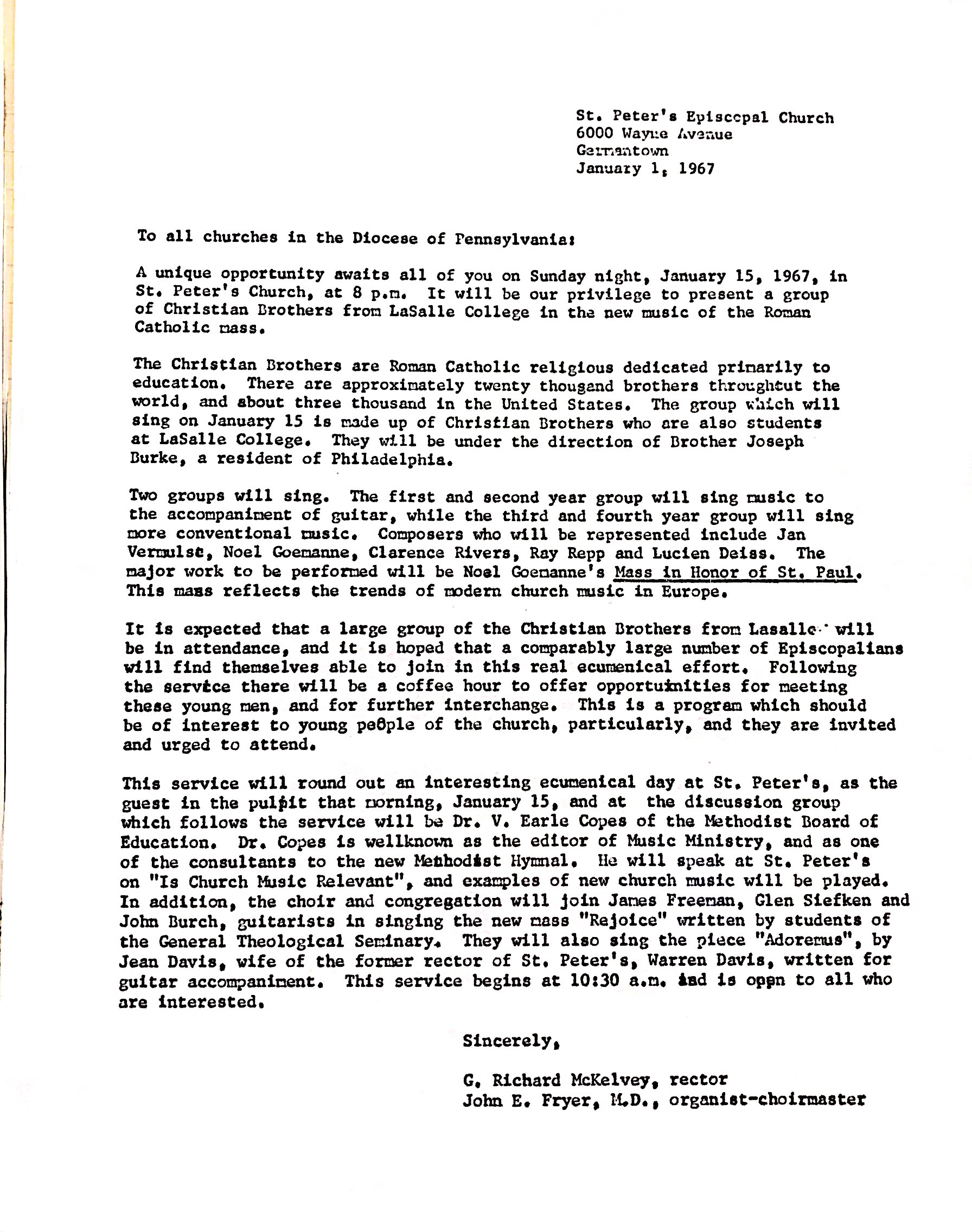Notice Regarding a Performance of New Music from the Roman Catholic Mass by the Christian Brothers at St. Peter’s Church, Germantown (1967)
