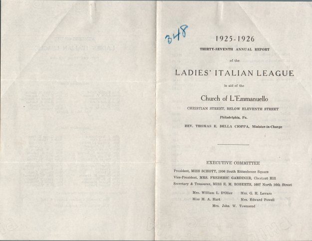 This entry was posted in L'Emmanuello (Italian) and tagged Archives of the Diocese of Pennsylvania, Italian-Americans, Ladies' Italian League, South Philadelphia, Thomas Edmund Della Cioppa on June 3, 2017 by mjk38.