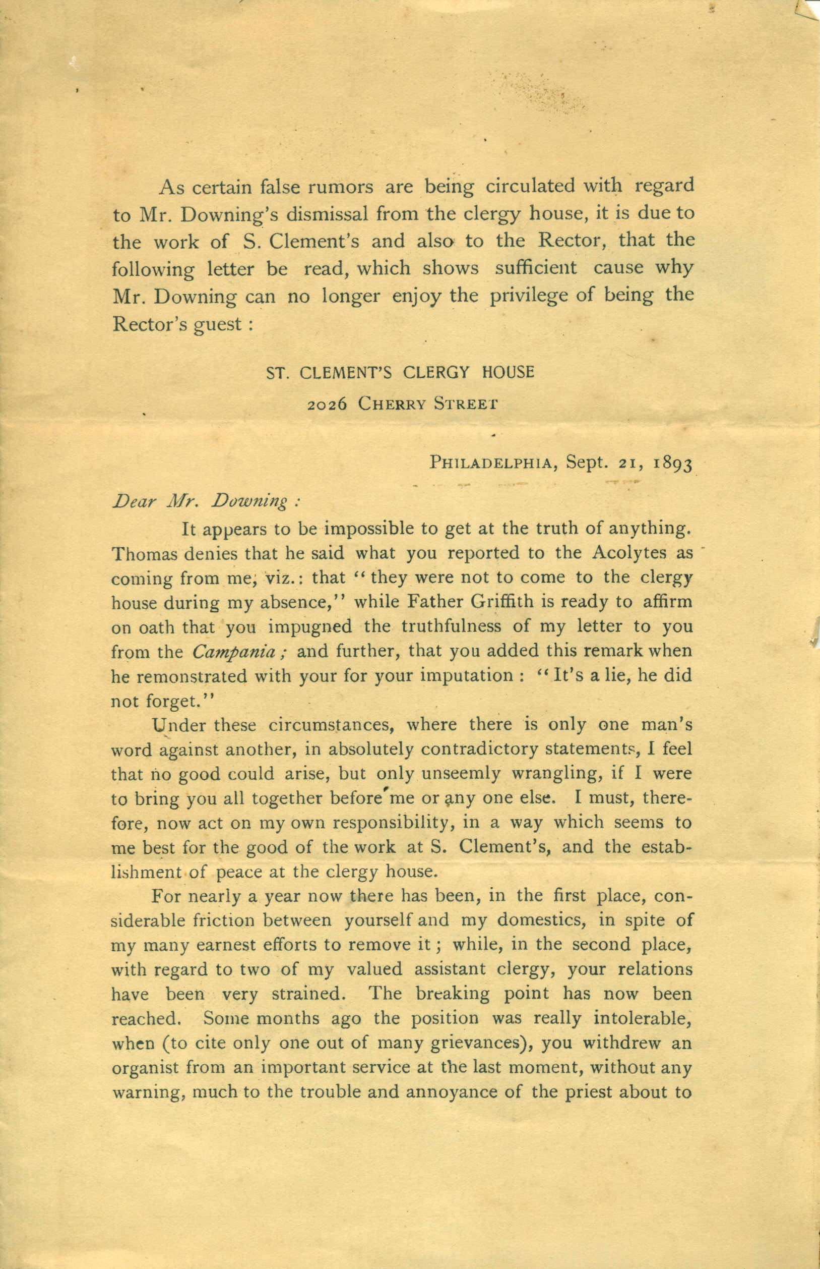 Lewis Thomas Pratt Downing’s Dismissal from Clergy House, St. Clement’s Church (1893)