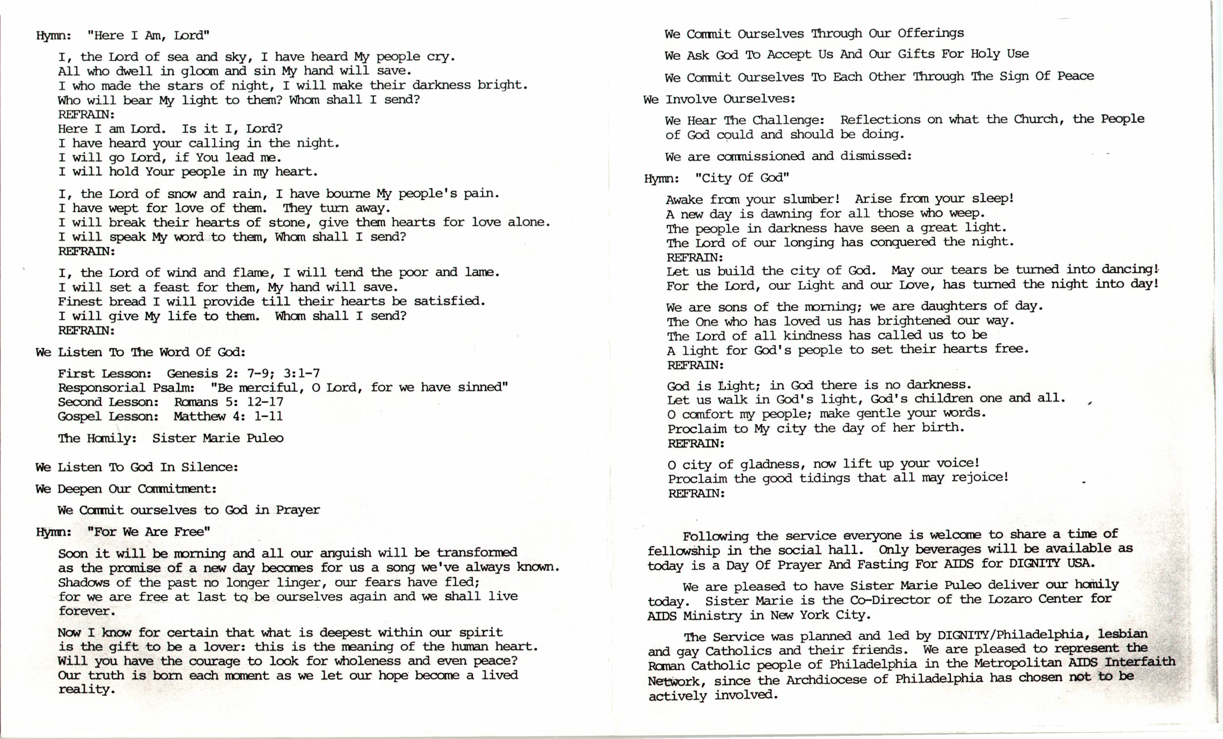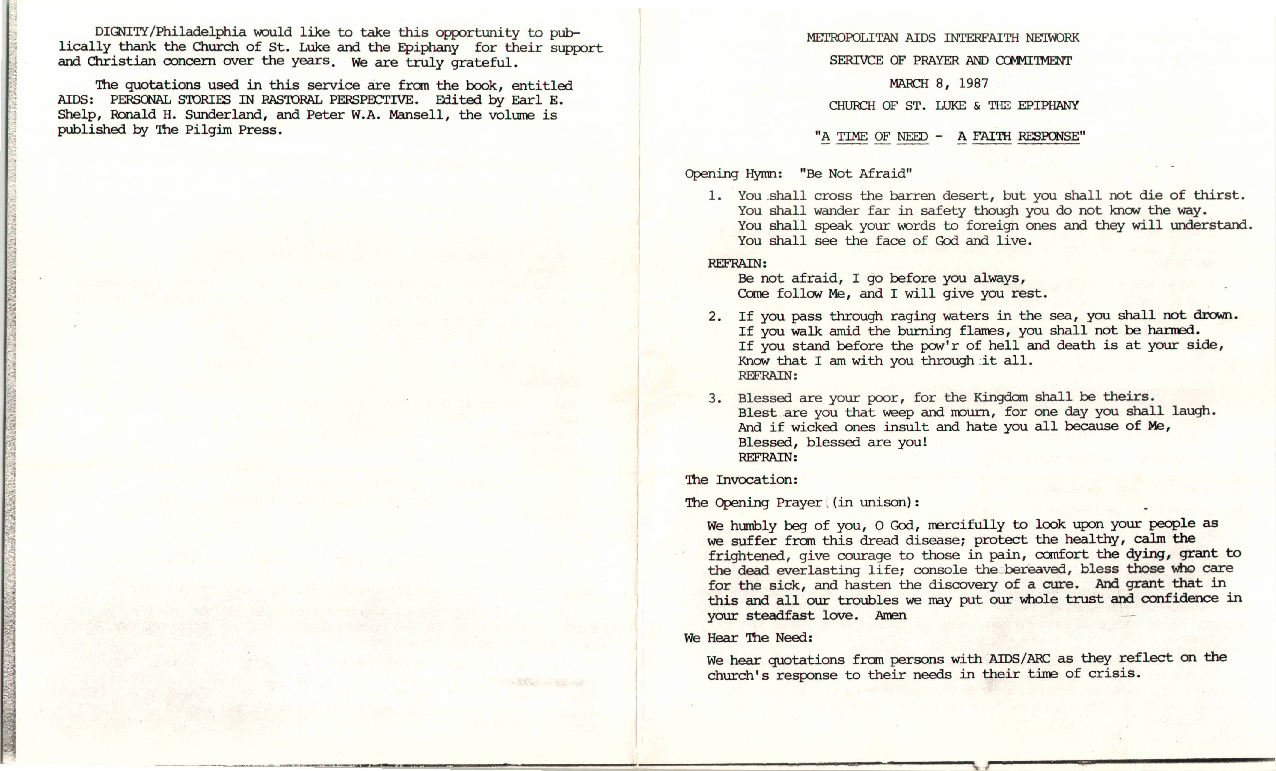 Leaflet for the Metropolitan AIDS Interfaith Network Service of Prayer and Commitment at Church of St. Luke and The Epiphany (1987)