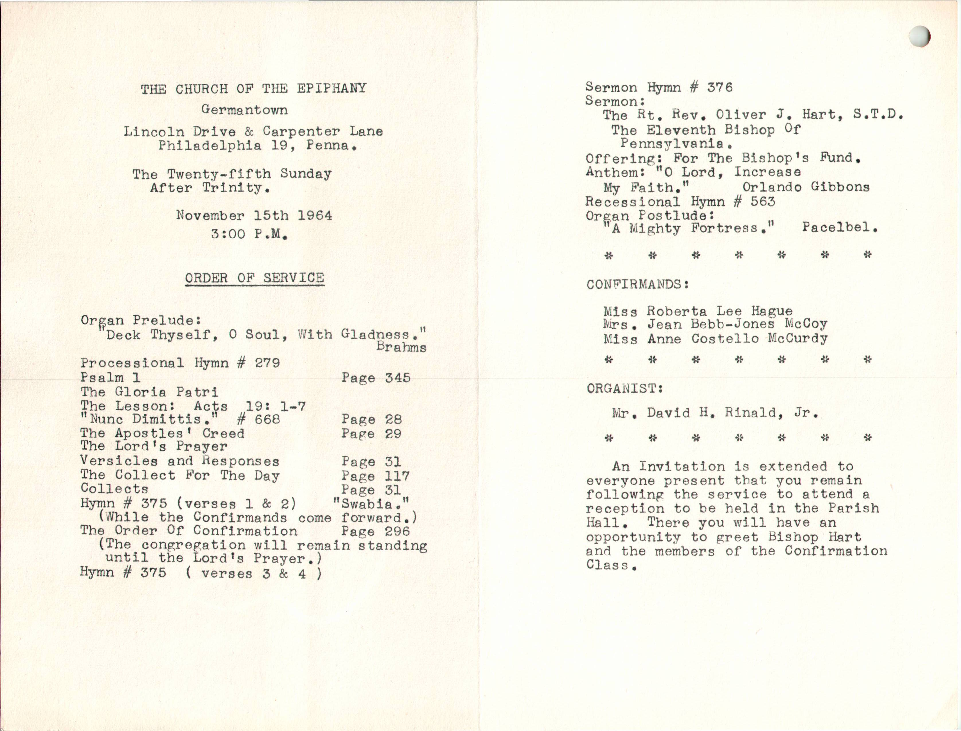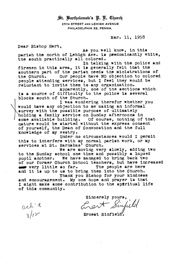 Letter from the Rt. Rev. Oliver J. Hart to Dr. W. Hamilton Aulenbach Regarding a Possible Merger Between a Suburban Parish and Christ Church and St. Michael, Germantown (1959)