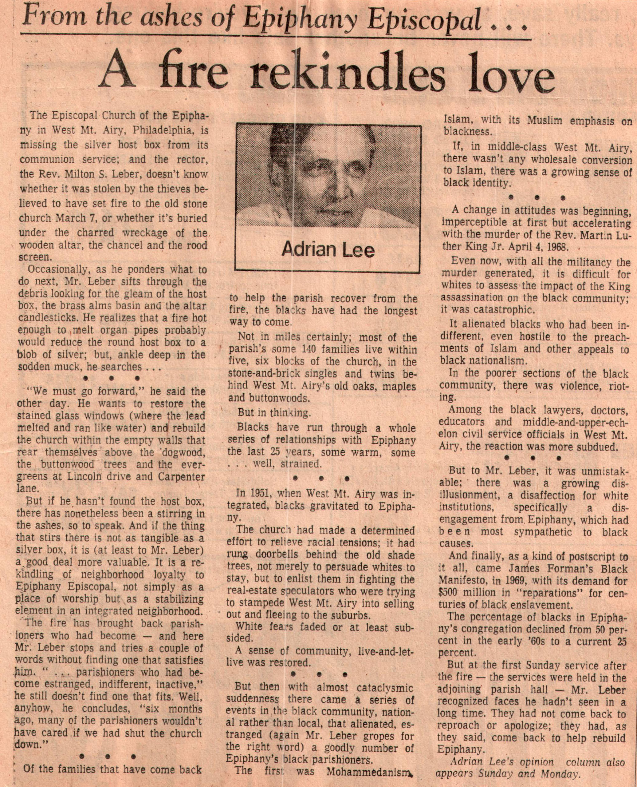 From the Ashes of [Church of the Epiphany, Germantown], a Fire Rekindles Love (1974)