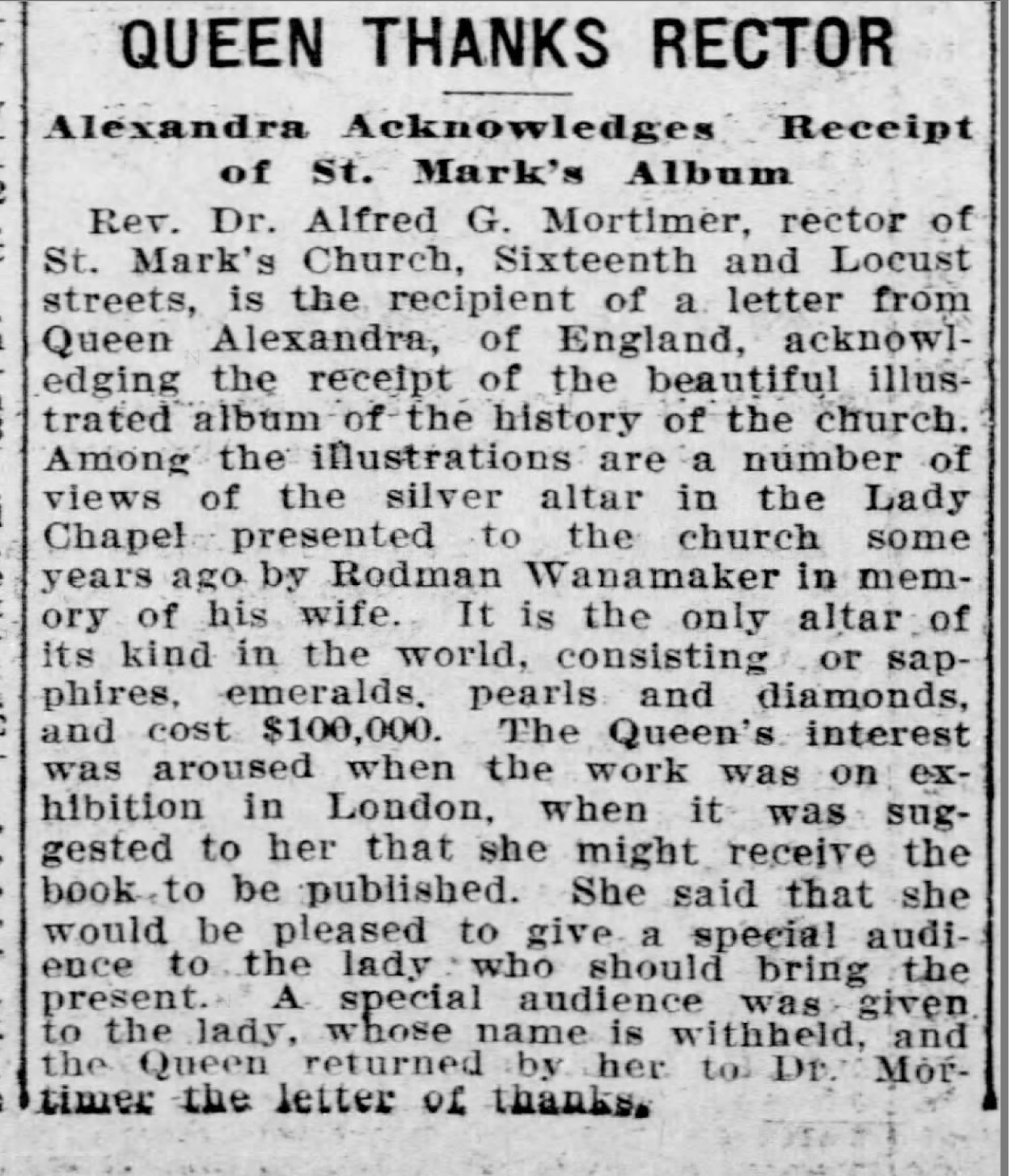 This entry was posted in St. Mark's Church (Philadelphia) and tagged Alfred G. Mortimer, Anglo-Catholic Parishes, Center City, Queen Alexandra, Rittenhouse Square, Rodman Wanamaker on October 6, 2015 by mjk38.
