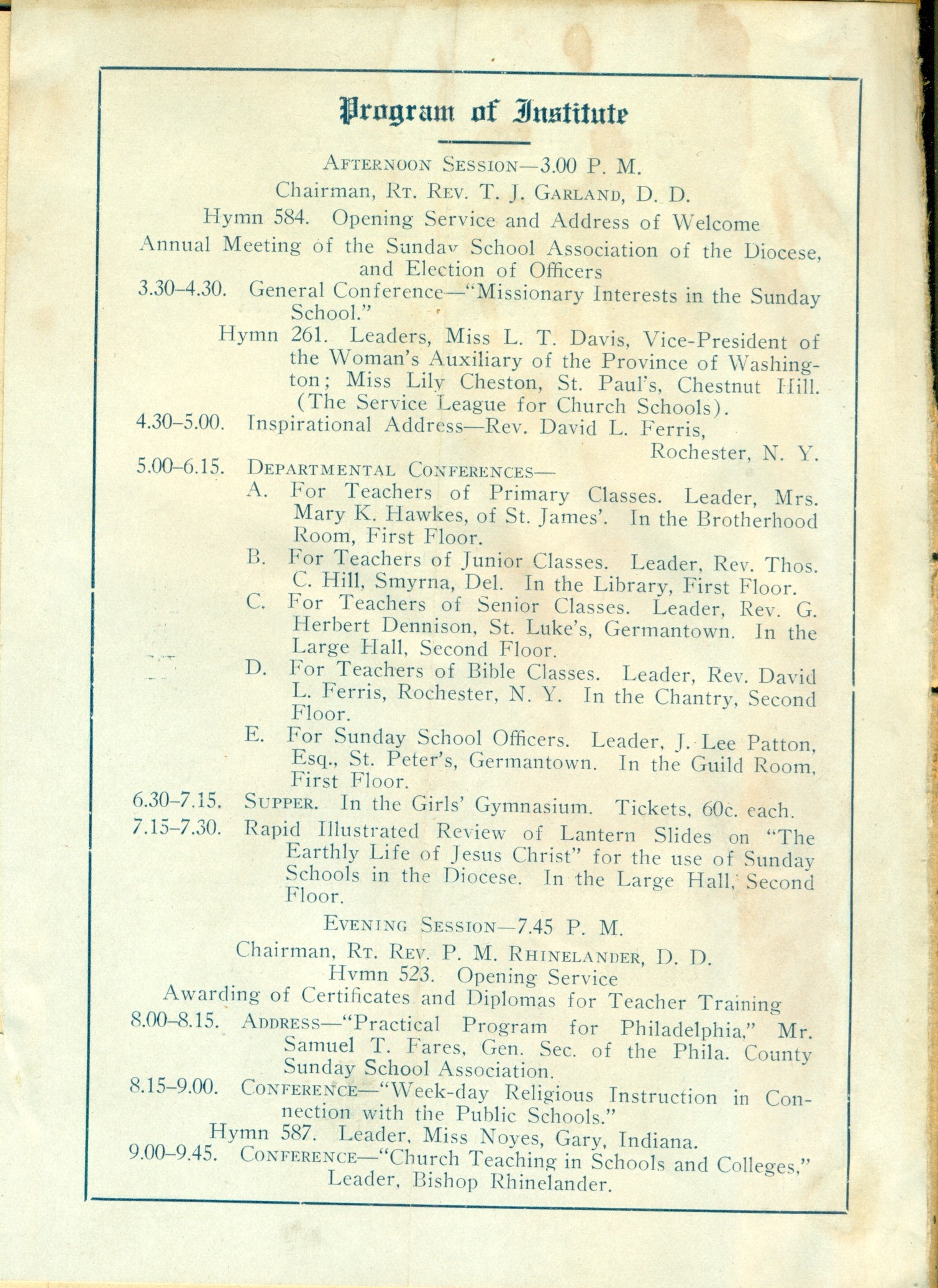 Leaflet for Annual Commencement Service of the Church Training and Deaconess School at St. Peter’s Church, Philadelphia, 1929, 1933, 1936, and 1938