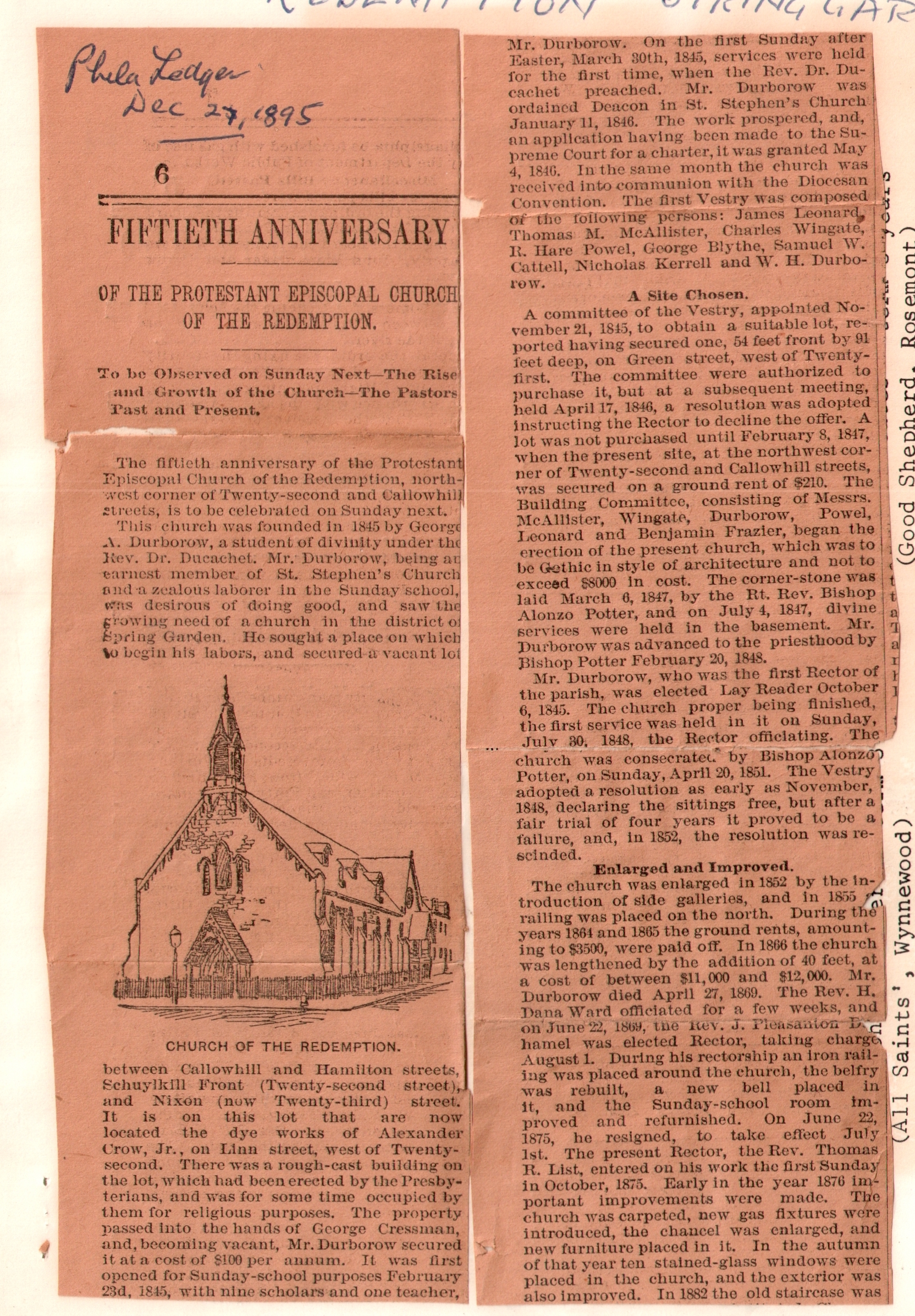 This entry was posted in Church of the Redemption, St. Anna's Church (West Philadelphia) and tagged Albert E. Clay, Church News of the Diocese of Pennsylvania, Fairmount, George Augustus Durborow, Spring Garden District, Thomas R. List, West Philadelphia on July 11, 2014 by mjk38.
