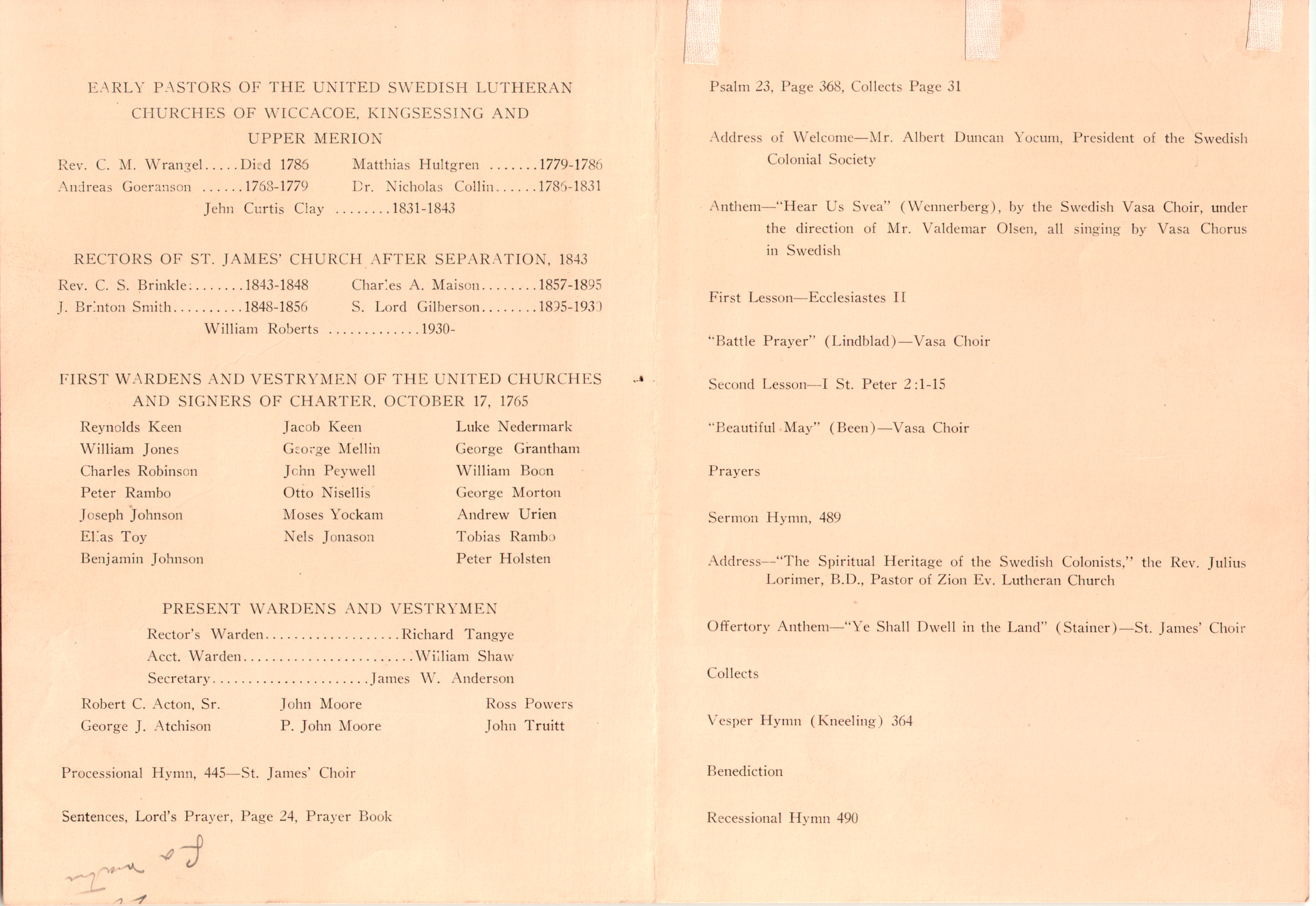 Leaflet for Service Commemorating the Sailing of Swedish Pilgrims from Gothenburg at St. James’ Church, Kingsessing (1937)