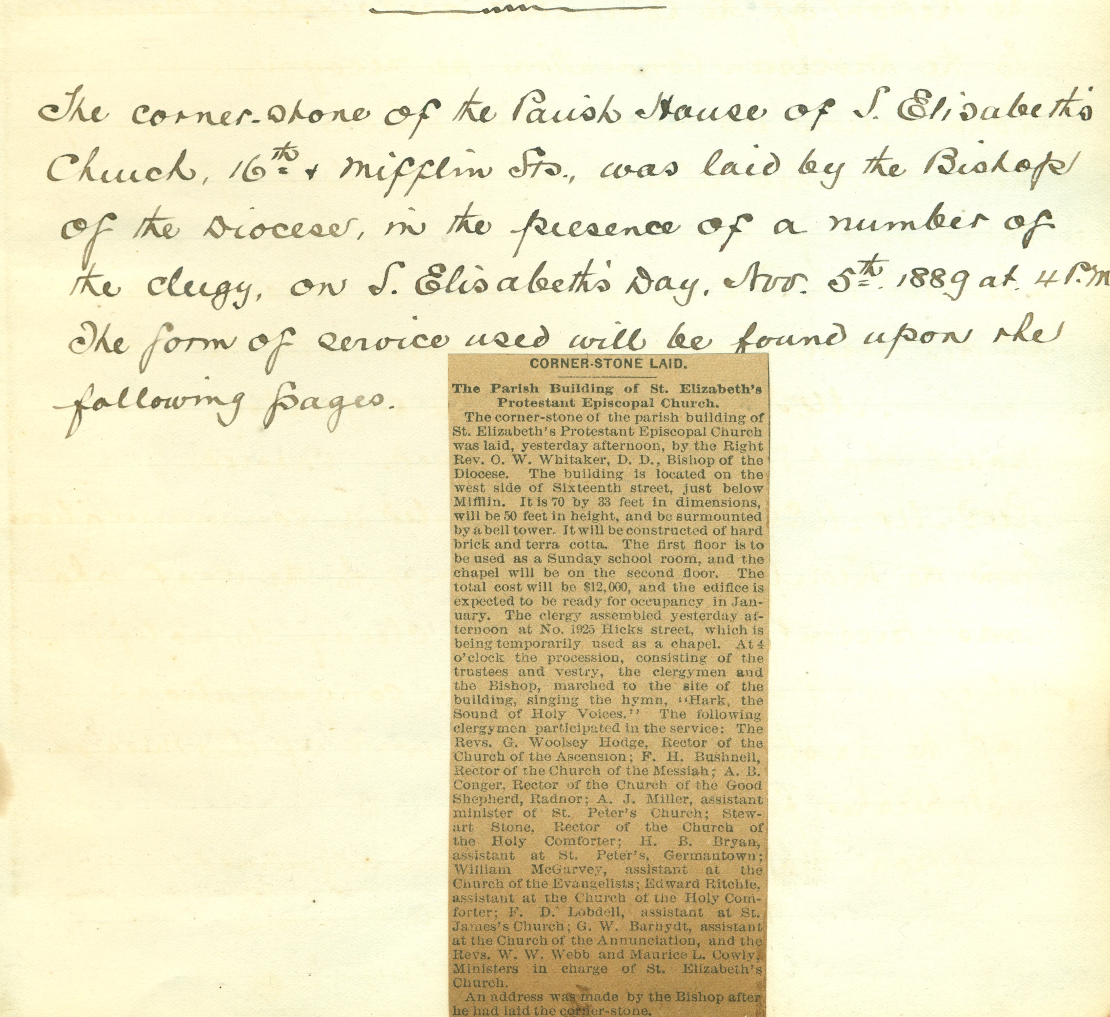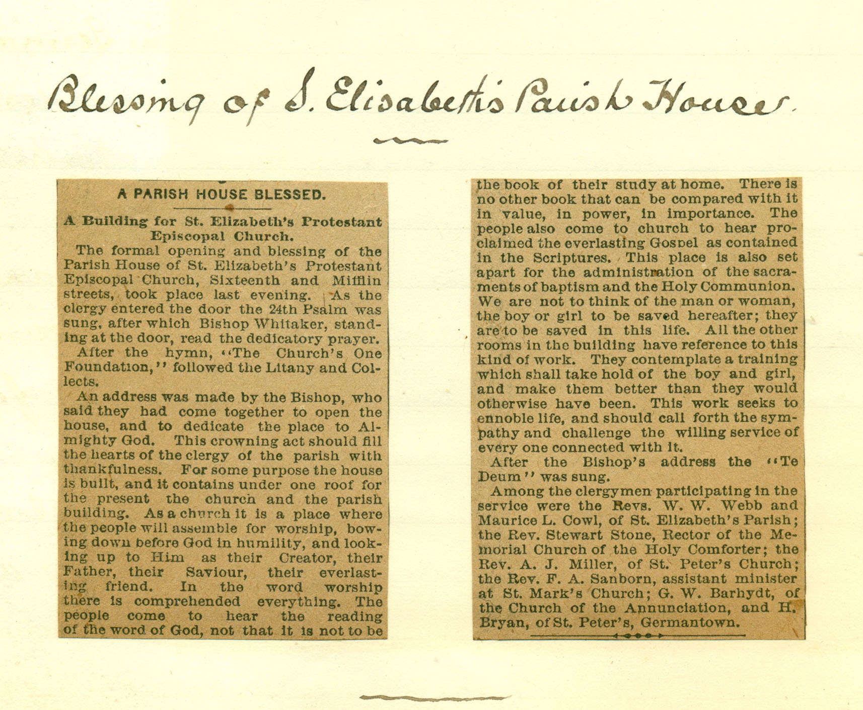 Newspaper Article about the Blessing of the Parish House at St. Elisabeth’s Church (1890)